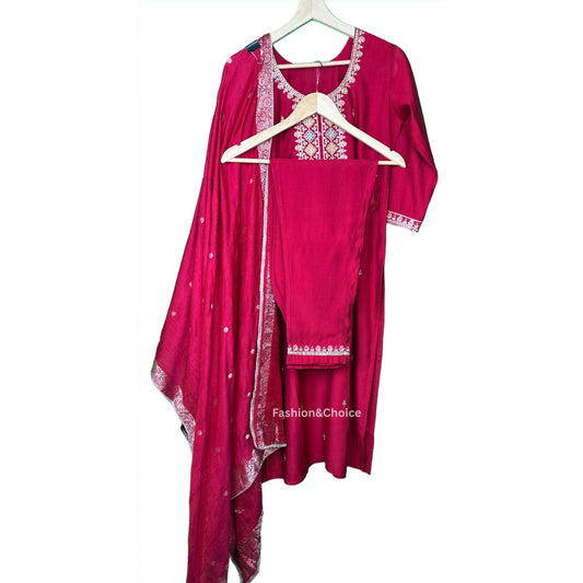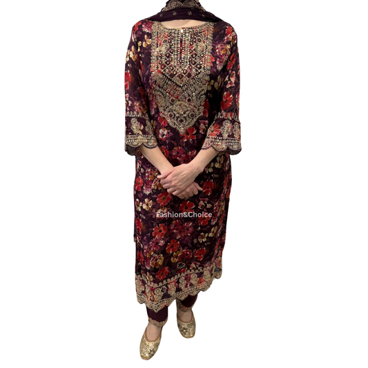 Wine Blossom – Floral Suit with Embroidery and Dupatta