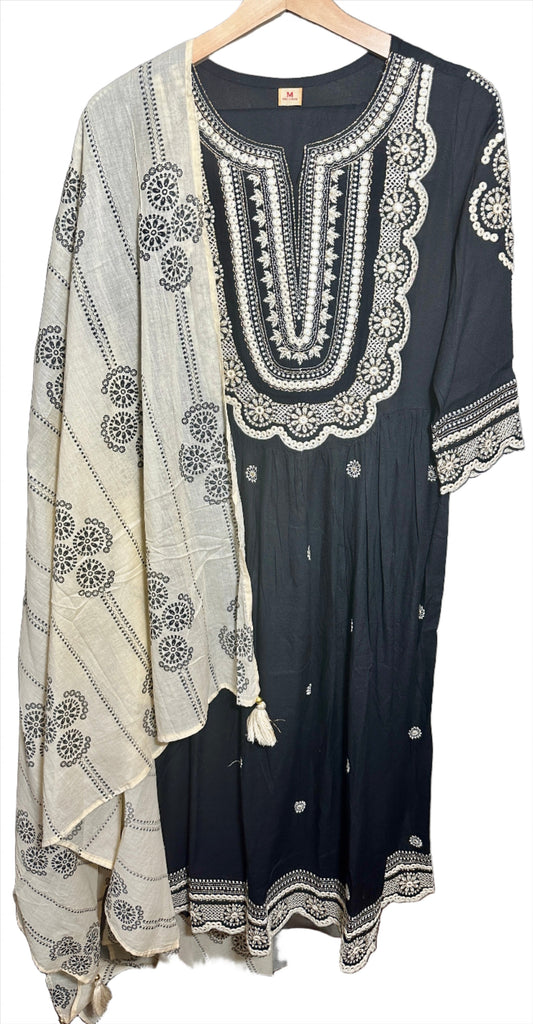 Black Nayara Cut Suit with Embroidery and Painted Dupatta