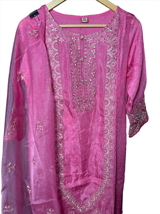 Pink Pakistani Style Silk Suit with Woven Organza Dupatta